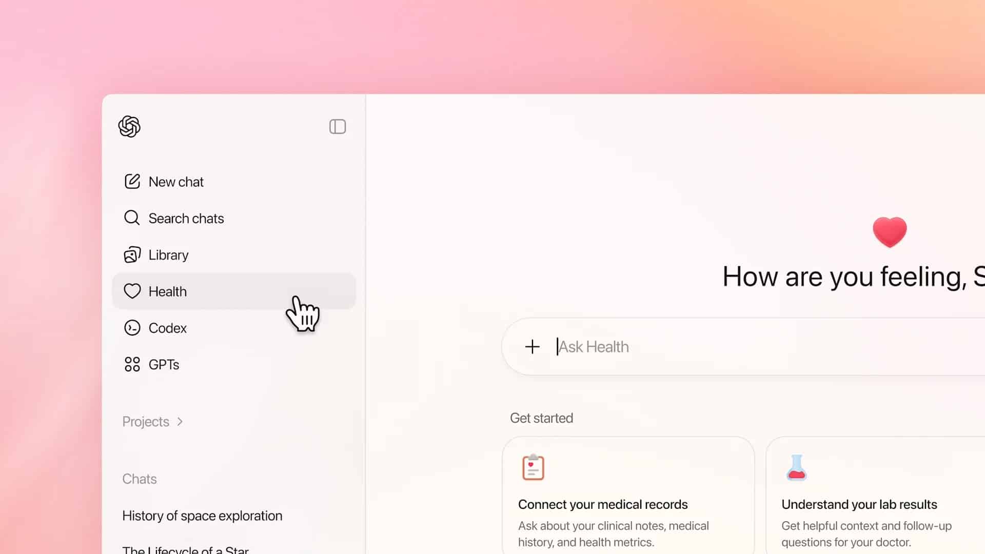 Dentro de ese espacio, las “memorias” también funcionan de manera separada. El objetivo es que el contexto de salud —por su naturaleza sensible— se quede en Salud, y que los chats generales no puedan acceder a los archivos, conversaciones o memorias creadas allí. Aun así, el usuario mantiene visibilidad: puede ver los chats de Salud en su historial para acceder a ellos, pero bajo las reglas de aislamiento del módulo.