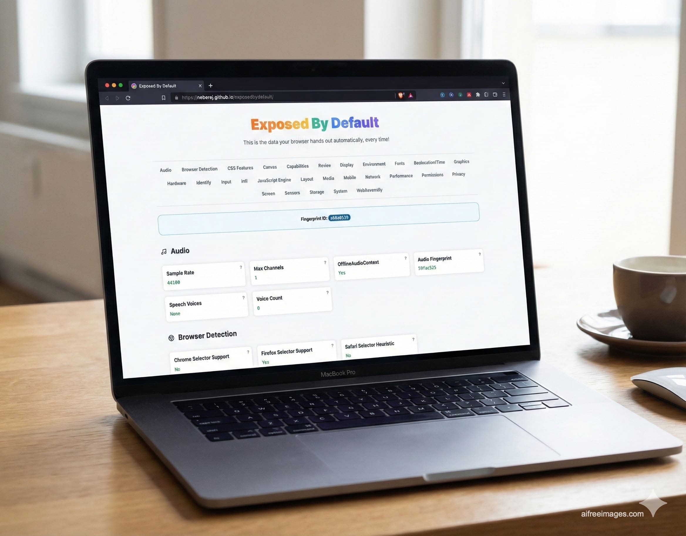 Una demo reciente de código abierto, Exposed by Default, lo muestra de forma brutalmente clara: basta con entrar para ver desfilar en pantalla decenas de parámetros que el navegador revela automáticamente. El resultado final es una huella digital casi única, capaz de distinguir un dispositivo entre millones, ideal para alimentar sistemas de publicidad, analítica avanzada o perfiles de riesgo.